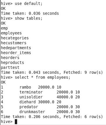 Importing a table from MySQL to Hive’s default database. The below command will help in copying “emp” table and data from MySQL to Hive “default” database as “employee”.