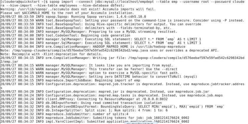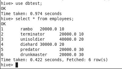 Importing a table from MySQL to Hive’s default database. The below command will help in copying “emp” table and data from MySQL to Hive’s user database (dbTest) as “employee” table.